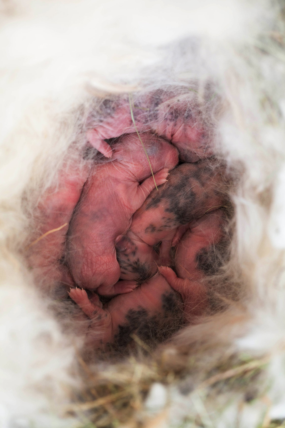 Rabbits will nest in many areas including parks, gardens and even right in the middle of a lawn. A rabbit’s nest is quite inconspicuous. It’s just a shallow depression in the ground. It’ll look just like a patch of dried grass. Under this dried grass is a bit of fur that is helping to keep the young rabbits warm.
