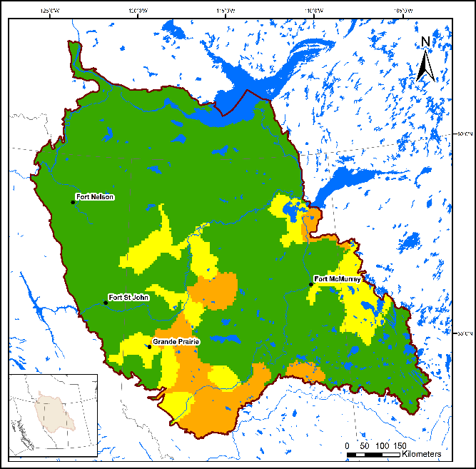 - Forest disturbance from industrial development puts boreal caribou at high risk across most of the region, suggesting population declines and possible loss from large areas. Industry best practices are unlikely to significantly improve the outcome.