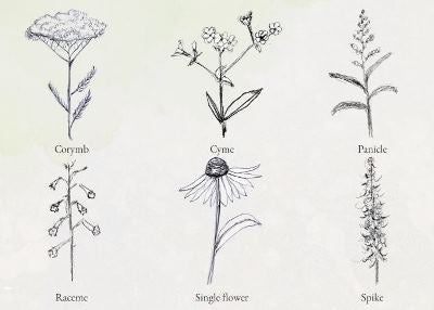 Long central stalk with a cluster of flowers along the top portion. Each individual flower has a stalk of its own, attached to the larger, shared central stalk.
