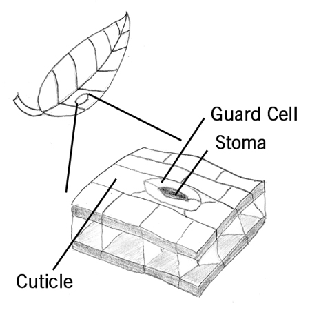 Pore-like structures on a leaf's surface surrounded by two guard cells that can open and close to allow for gas exchange. The plural of stoma is stomata.