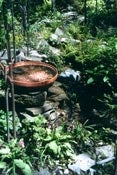 She provides water in a variety of containers from fancy concrete bowls to plant pot saucers. “The grackles like the three-feet-wide bowl, which is quite deep, and they splash like mad, whereas the robins prefer a slightly smaller bowl next to the biggest pond,” she notes.