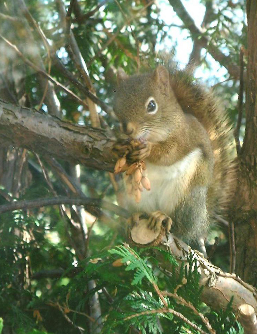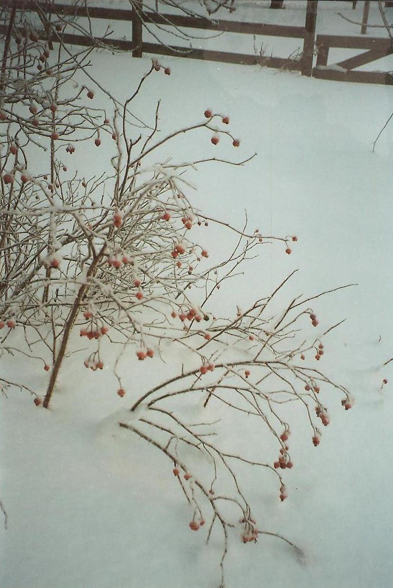 provided food for wild critters. Partridge and their broods of young became frequent visitors. A disused paddock was planted with a few balsam fir (future Christmas trees!), and a black walnut sprouted almost instantly to provide shade. Thus began a favourite area, “the Grove,” just west of the new barn, a great snow-stopping windbreak. Soon a wild apple and a hawthorn provided some food for visitors. An old white spruce came down in the south wind and was left to rot, its tall stump becoming a woodpecker home and a ‘trellis’ for a Virginia creeper vine. Wild raspberries grew up around it, and pruning piles provided shelters.