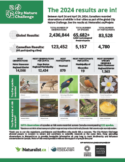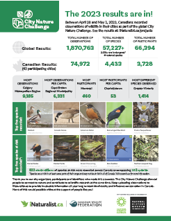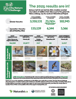 Make your observations. Record and upload photos and sounds of wild plants and animals through iNaturalist.ca or the iNaturalist app. Observations made in participating cities (see list below) will automatically be added. If you’re not in a participating city, you can still make observations by joining the City Nature Challenge Canada 2026: non-registered cities project in iNaturalist. From bees, to birds, flowers to trees, and funga to mammals, every observation of a species found in Canada will add to our overall total. In 2025, Canadians registered 155,139 observations. Let’s see if we can top 200,000 in 2026!