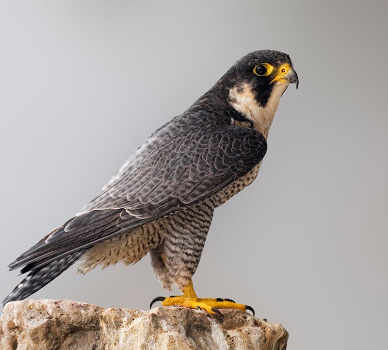 Generally smaller and more streamlined than hawks, Peregrines, like all falcons, have small heads, firm compact plumage, and long pointed wings—adaptations that allow them to fly at great speed. In flight they use quick, powerful wing strokes. Their powerful talons and strong hooked beak, equipped with a notch or “tooth” that aids in severing the spinal cord of avian prey, mark them as highly specialized predators.