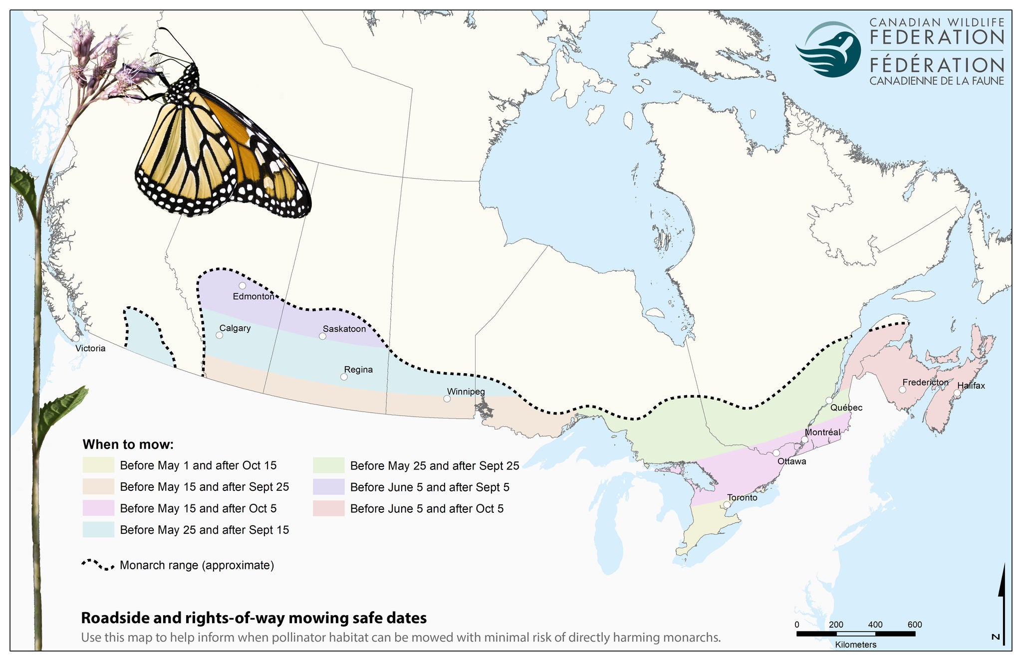 CWF is working with landowners and rights-of-way managers to restore habitat for Monarch and other pollinators. This year CWF is also releasing a mowing map to aid rights of way managers in timing roadside mowing beyond the safety zone to reduce impacts to Monarch. The maps provide the ideal spring and fall safe dates, before and after which roadside habitat beyond the safety zone can be mowed without risk of directly harming Monarchs.