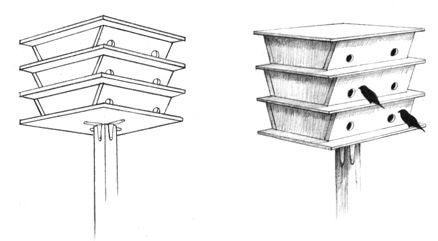 • As the martin colony grows over time, additional storeys may be added to this multi-unit dwelling.