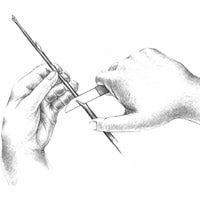 • Discard the tips of the shoots. With pruning shears or a knife, cut the remainder of each shoot into lengths of 15 cm to 20 cm. At one end, make the cuts straight; at the other end, cut diagonally, just below a node (the point where a leaf usually appears).