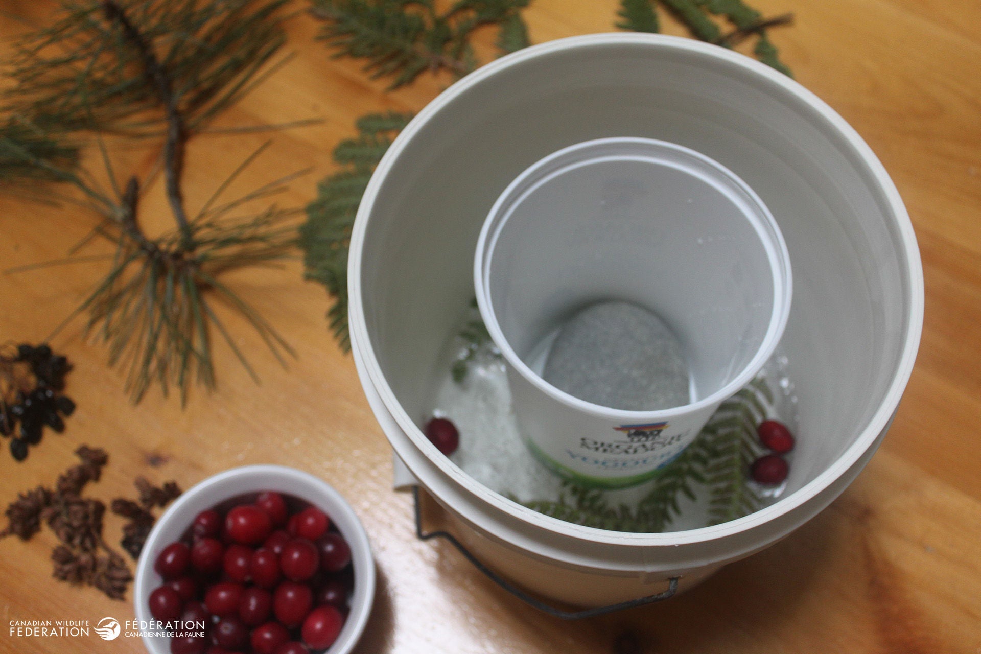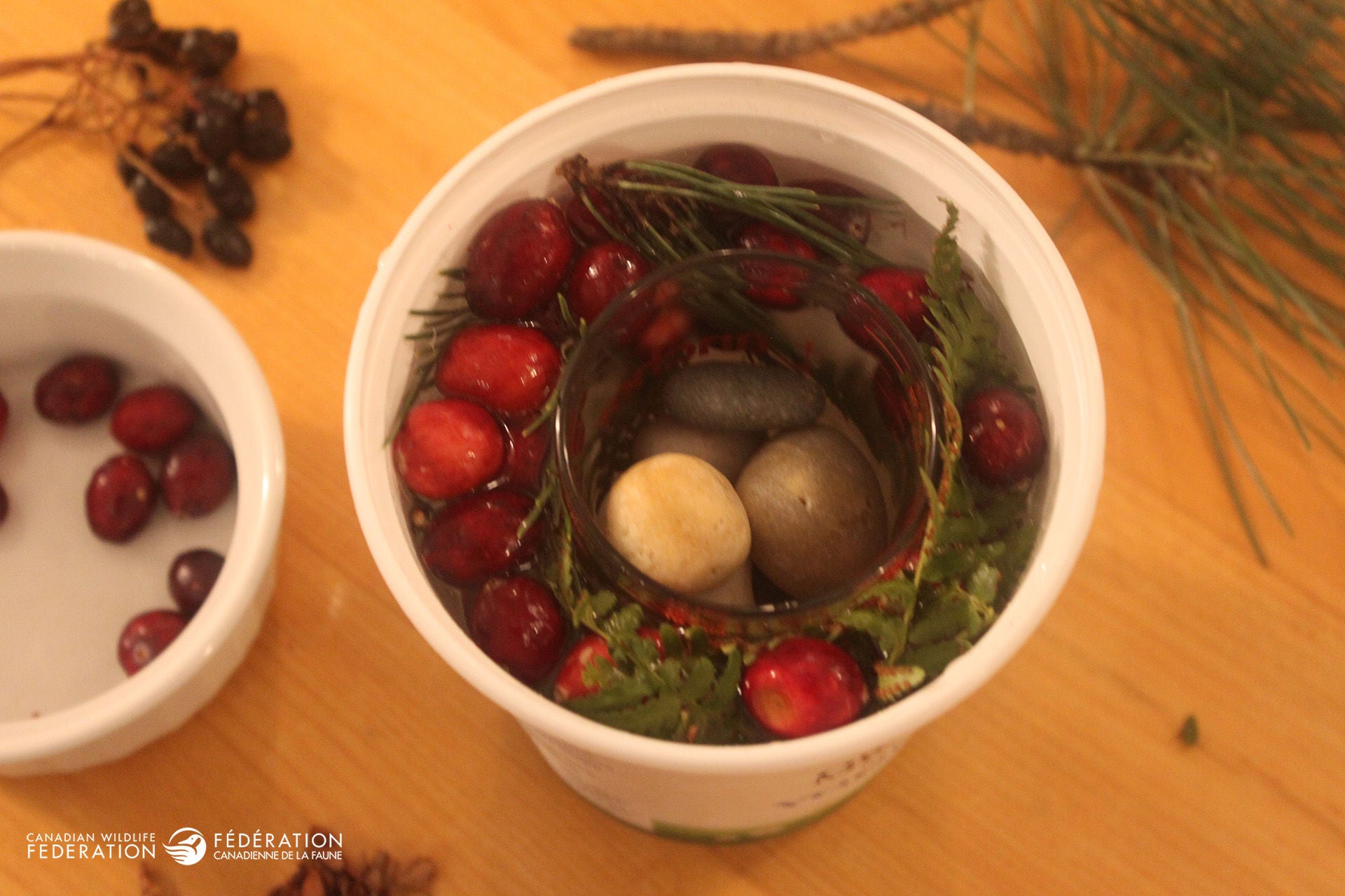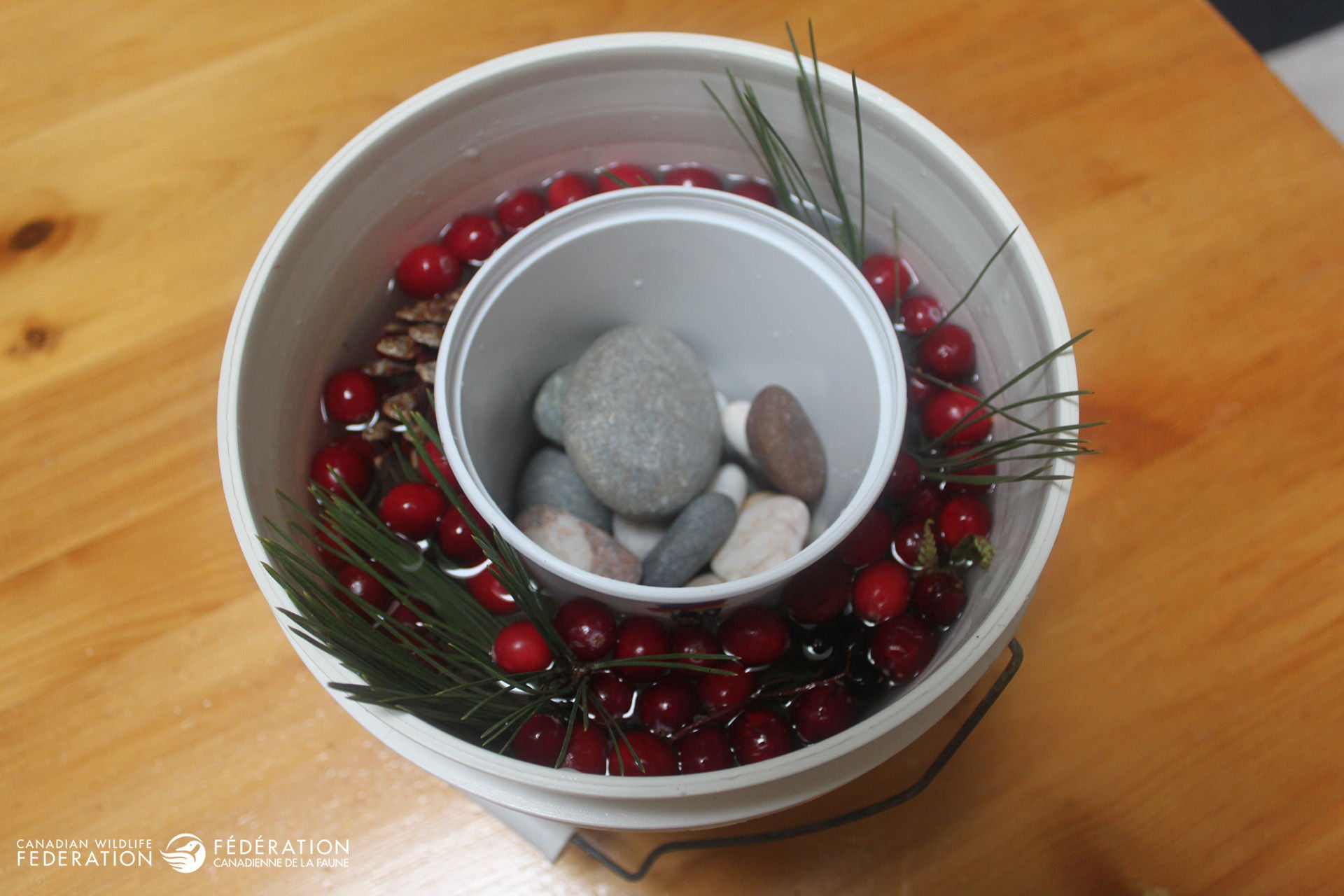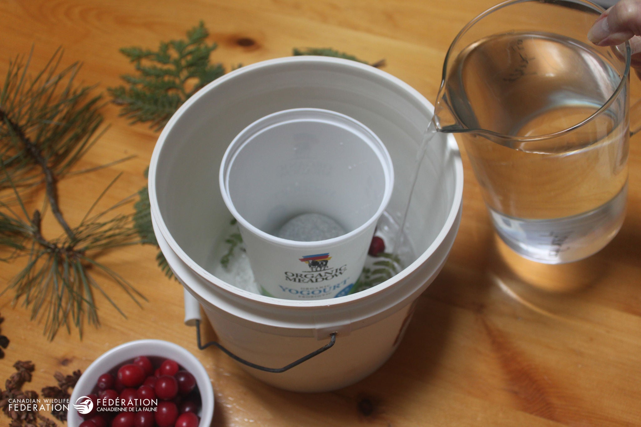 Fill the gap between the two containers with water. This will be your lantern’s wall. Don’t fill it right to the top as you will be also adding your berries and greens. This also allows space for the water to expand as it freezes. You may need to add more stones if your inner container begins to move.