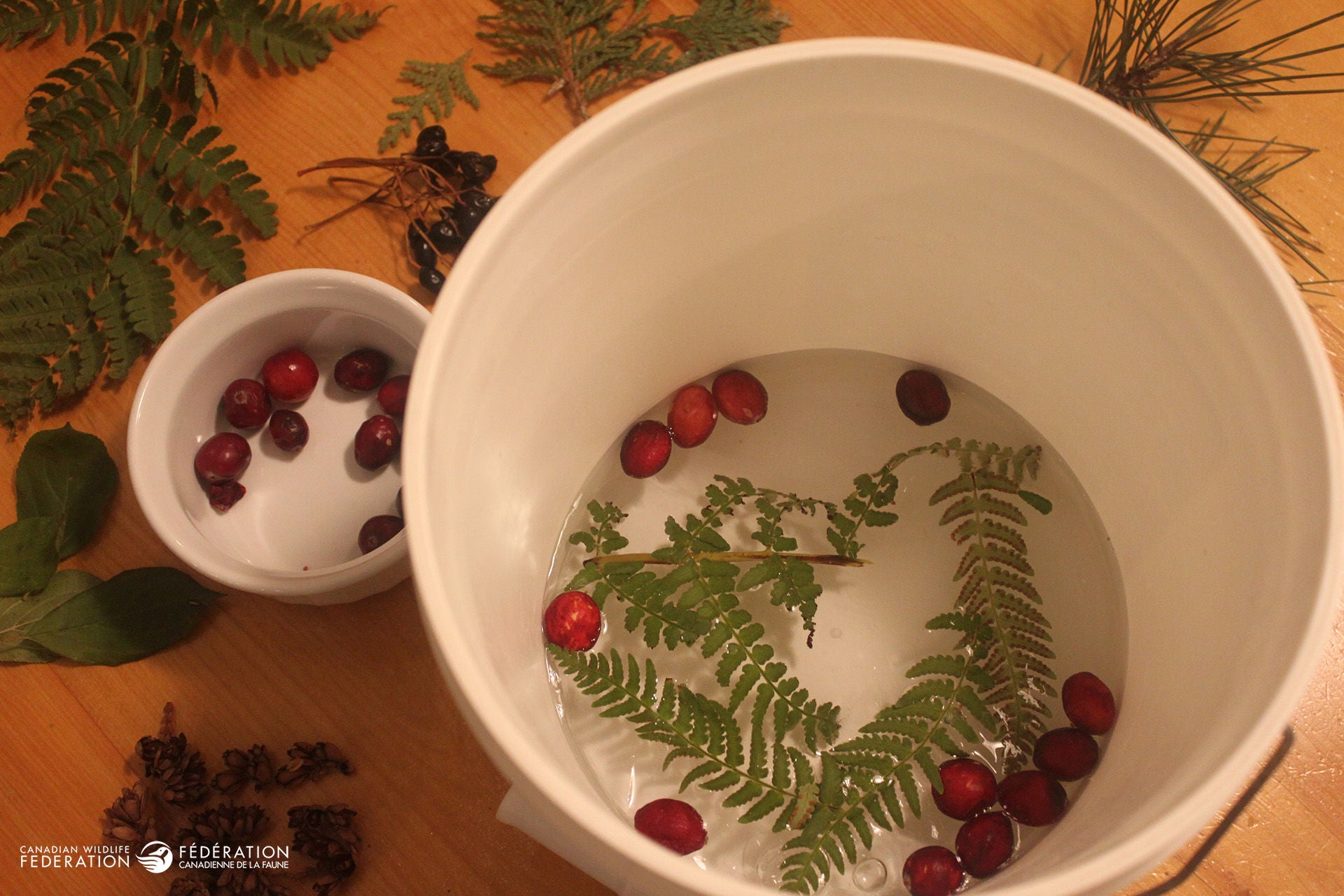 Natural elements can include fern fronds, berries,