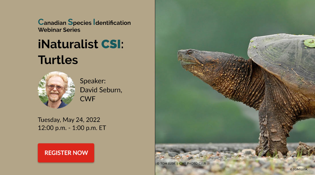 Join the Canadian Wildlife Federation (CWF) for a webinar in our Canadian Species Identification Webinar Series, demonstrating how to photograph and identify turtles using iNaturalist Canada, with CWF’s very own turtle expert David Seburn in English and CWF’s Annie Belair in French. Freshwater turtles are in decline throughout Canada. CWF’s HelpTheTurtles.ca initiative is working to change this but we need your help! Knowing where turtles are found is an important first step to fixing the problem. Tallying everyone's observations will help us target which roads we need to look at for mitigation measures and which wetlands we need to keep an eye on. By uploading your turtle sightings to iNaturalist.ca, you can directly contribute to turtle conservation. iNaturalist has become one of the world’s most popular nature apps and the Canadian Wildlife Federation has led the charge in bringing it to the forefront of Canadian citizen science. CWF is carrying out our own surveys on roads and in wetlands for at-risk turtles and working with Scales Nature Park, but we can't be everywhere. Your information is critical so we can work with municipalities and transport agencies to reduce the risks to turtles. Learn how to identify turtle species and take identifiable photos of turtles to help us, help them! English Webinar Date: May 24, 2022, 12:00-1:00 ET French Webinar Date: May 26, 2022, 12:00-1:00 ET