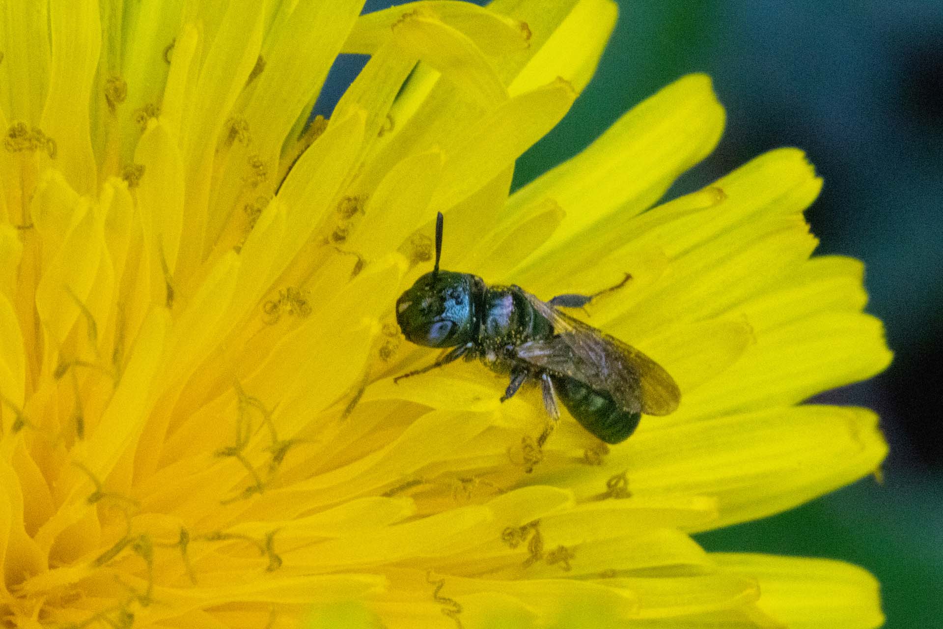 Also called dwarf carpenter bees (three to nine mm in size), Ceratina are dark metallic blue (but can have different coloration in other parts of the world), and their bodies are quite shiny. They can have a pale mark near their mouth, usually only visible with macro (close up) photography. They can be distinguished from other small bees by looking at the apex of their abdomen - theirs is quite abrupt, forming an inverted peak.