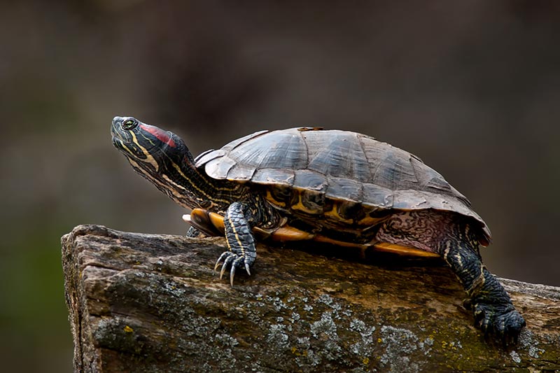 The Red-eared Slider has a slight ridge, or keel, running down the center of the upper shell. There is usually a wide red stripe on either side of the head, behind the eyes, but this can fade with age.