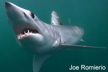 The shortfin mako (Isurus oxyrinchus) is one of five species in the family commonly known as mackerel sharks which includes the great white shark and basking shark. The mako shark is described as spindle shaped, deep blue to purple above and white below, with a conical head, sharply pointed snout and crescent shaped caudal fin. The u-shaped mouth has large sharp teeth that protrude outside of the mouth even when closed. It can reach a maximum length of over 4 m.