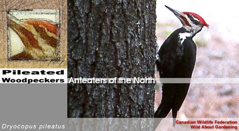 Pileated woodpeckers are primarily insect eaters. Their favourite food is carpenter ants. They listen for ant activity in an old rotting tree and then pound away. Once through the wood, they use their long, barbed and very sticky tongue to get the ants. Pileateds also feed on ground ants, beetles, cluster flies, moths, mosquitoes, caterpillars and other larvae as well as a small amount of fruits and nuts such as wild grapes, dogwood berries, cherries, and acorns.