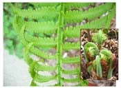 One way to identify a fern is by the arrangement of its spores, which are similar to seeds. They are so small and dust-like that we usually notice only the spore clusters that contain them. These can be found on the underside of leaflets (fertile leaflets), such as on the fragile and Christmas ferns; or on separate stems (fertile leaves), such as on the sensitive and ostrich ferns. Then there is the royal fern, whose spore clusters form on a stem at the tip of some of its leaves. Another variation is the interrupted fern, whose brown fertile leaflets are found sandwiched between sterile leaflets.