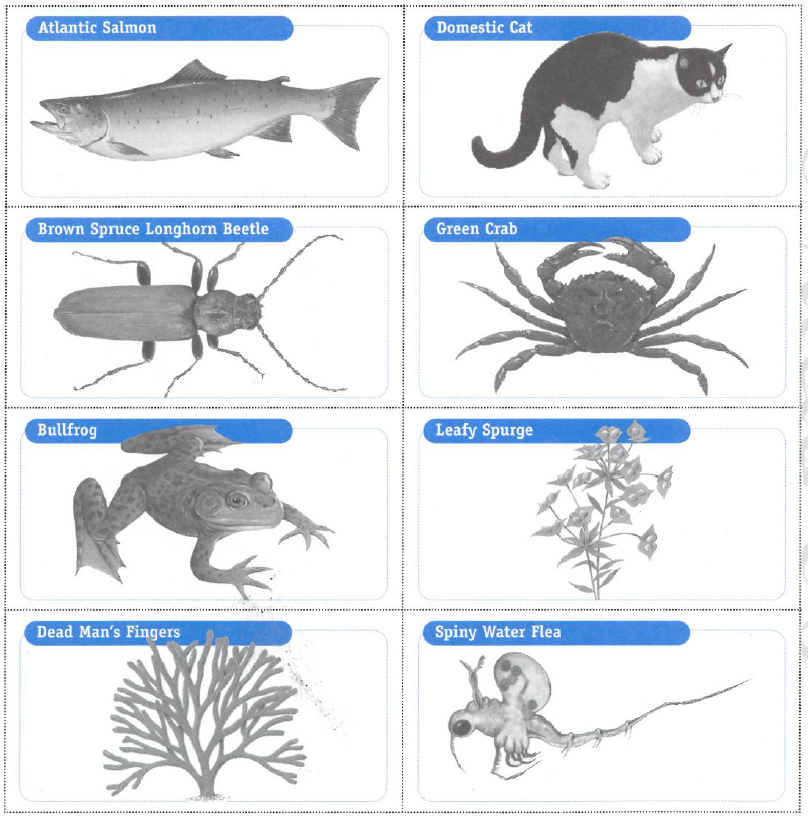 - Confirm the correct matches as a class, in accordance with the following answer key: 1) Atlantic salmon, 2) brown spruce longhorn beetle, 3) bullfrog, 4) dead man's fingers, 5) domestic cat, 6) green crab, 7) leafy spurge, 8) spiny water flea