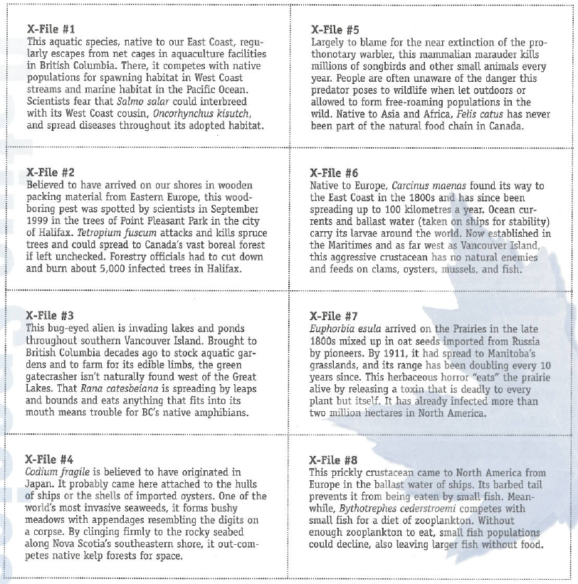 - Students should then share their research findings with the class in a written or oral report. Alternatively, ask them to draw each invader and describe (briefly and without naming the species) how it was transplanted on a separate sheet. Turn these "X-files" into new sets of cards to be copied and distributed among small groups for another round of the matching activity described above.