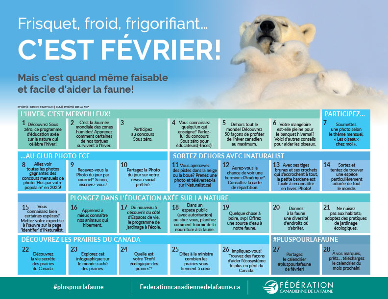 Voilà pourquoi notre calendrier d’actions #pluspourlafaune comprend toutes sortes de choses à faire pour aider la faune. Se renseigner sur les habitats du Canada est tout aussi important que de planter des arbres pour soutenir ces habitats. Parler de ce que vous avez appris ou de ce qui vous tient à cœur va motiver les autres à agir aussi. Partager vos photos de la nature peut venir en aide à une espèce méconnue autant que les modifications à nos lois peuvent aider cette espèce à survivre. C’est l’effet domino.