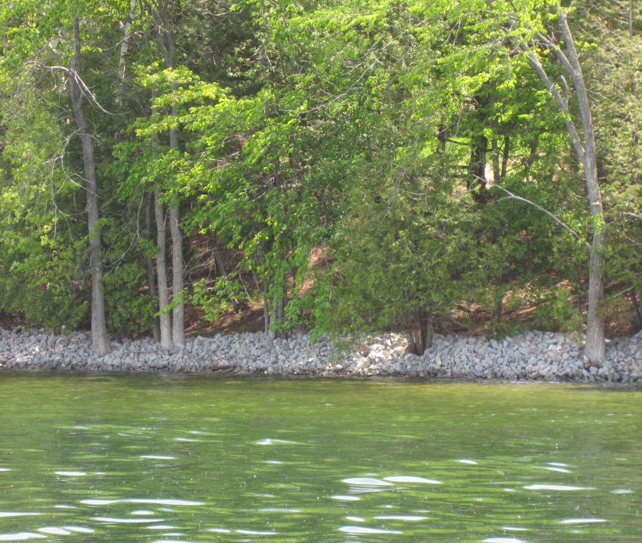 De grosses pierres comme le granit et des blocs de béton modulaires appelés « enrochements » sont utilisés pour contrôler l’érosion et stabiliser les berges. Si, dans certains endroits, cette pratique peut être bénéfique pour la faune, lorsqu’elle est utilisée inutilement dans des zones auparavant naturelles, elle peut entraîner la disparition de plantes fournissant de l’ombre et d’autres végétaux qui sont des éléments importants de l’habitat des poissons. Les enrochements peuvent retenir la chaleur et entraîner une pollution thermique locale. Dans un bassin versant, ils peuvent nuire à l’habitat en limitant la migration naturelle du cours d’eau, en diminuant le dépôt naturel de sédiments et en interférant avec le mouvement du gravier et du bois dans les cours d’eau. Les espaces dans les enrochements peuvent piéger les tortues, en particulier celles qui viennent de naître, et l’ajout de roches sur des rivages auparavant naturels peut détruire l’habitat des grenouilles, des crapauds et des oiseaux nicheurs .