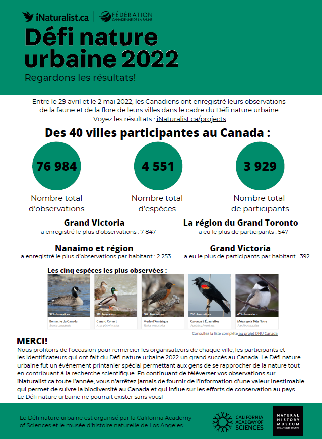 Nous profitons de l’occasion pour remercier les organisateurs de chaque ville, les participants et les identificateurs qui ont fait du Défi nature urbaine 2022 un grand succès au Canada. Le Défi natureurbaine fut un événement printanier spécial permettant aux gens de se rapprocher de la nature touten contribuant à la recherche scientifique.