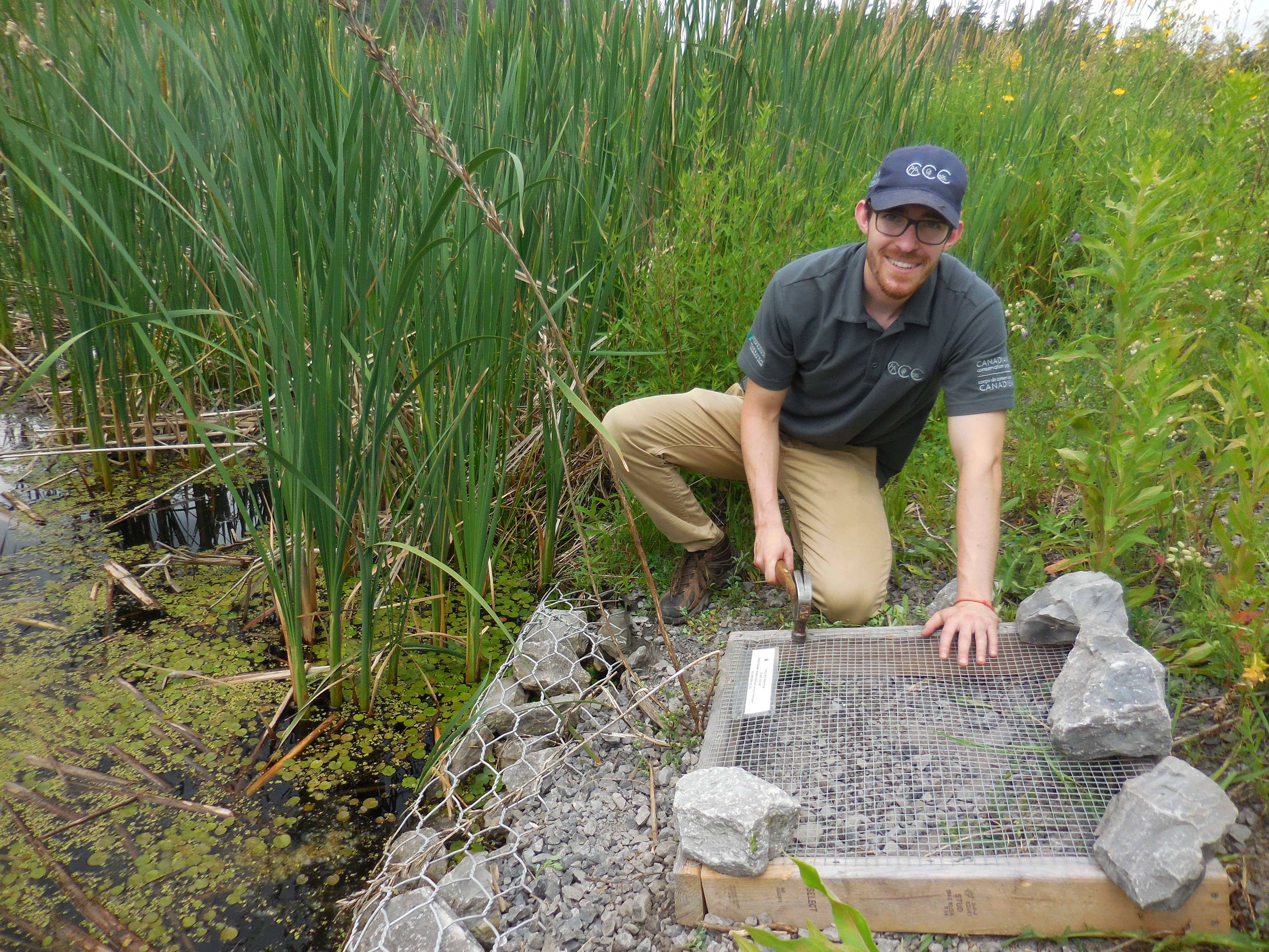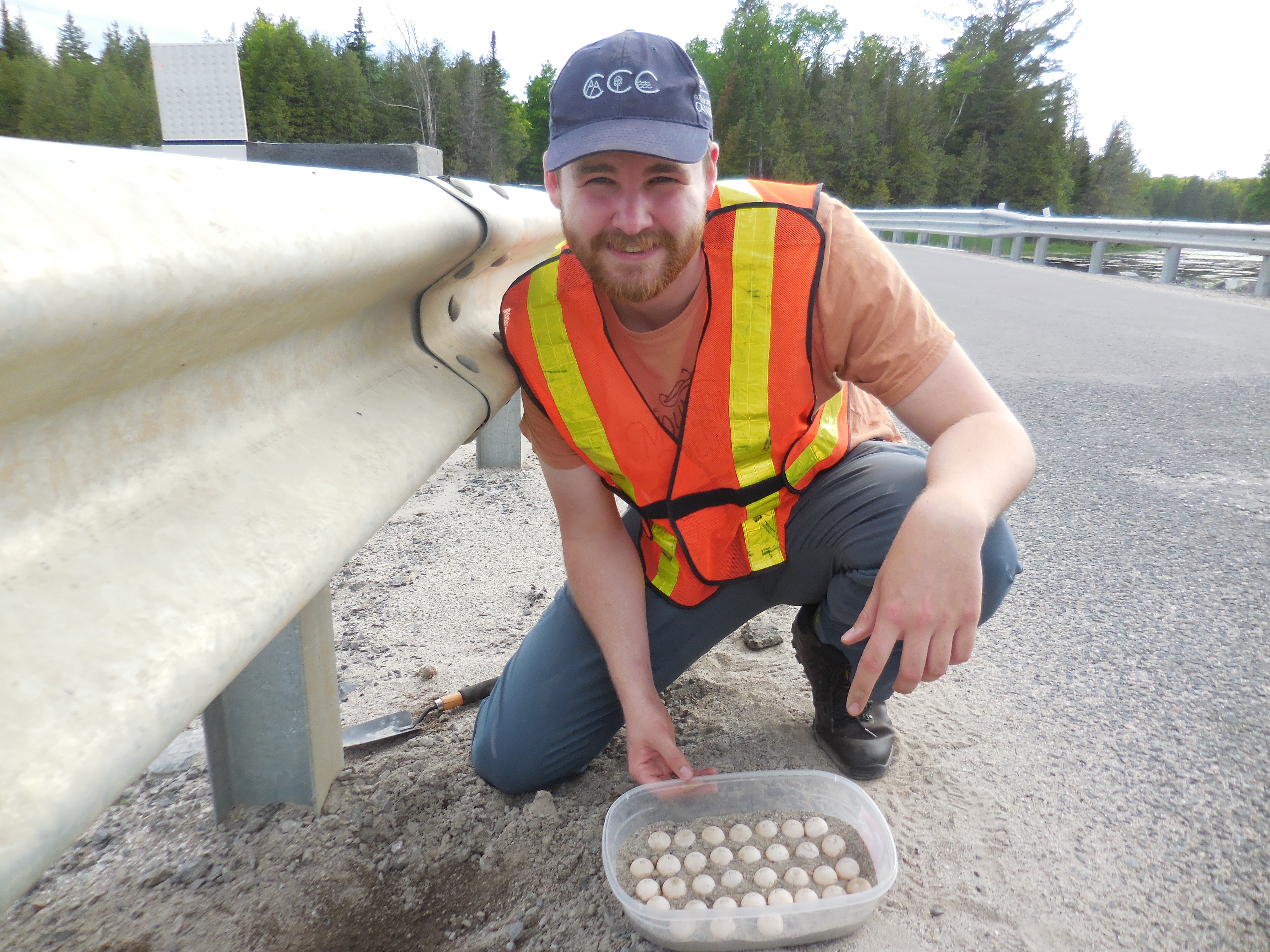 Une partie de notre travail à Ottawa vise à identifier les endroits importants de nidification pour les tortues. Il est essentiel de protéger les nids de tortues pour deux raisons. D’abord, les taux de prédation sur les nids peuvent être extrêmement élevés dans certaines régions. Il s’avère donc très bénéfique pour les populations de localiser ces nids et de les protéger en mettant des cages autour ou en creusant et en couvant les œufs. Les ratons laveurs et autres prédateurs creusent les nids et mangent plusieurs des œufs. Dans certaines régions, les ratons laveurs prennent presque tous les œufs, ce qui menace les populations de tortues. En mettant des cages autour des nids, nous pouvons éloigner les prédateurs et protéger les œufs jusqu’à l’éclosion. Secondement, en repérant le nid de tortues menacées ou en voie de disparition, nous engendrons l’établissement de mesures de protection légale dans la région à proximité du nid.