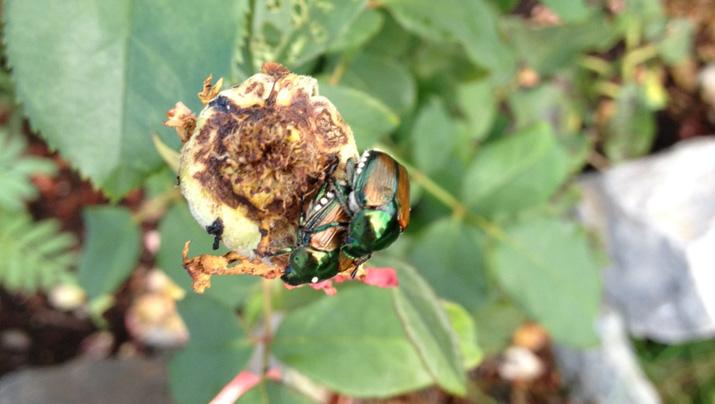 Les scarabées japonais causent des dégâts parce qu’ils consomment les tissus entre les nervures des feuilles, et ils peuvent ainsi faire de grands trous dans les feuilles et les fleurs.