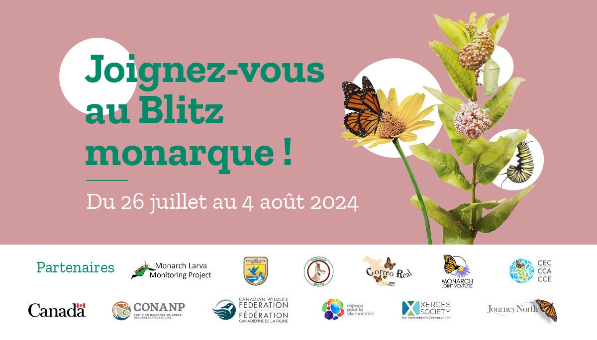 Suivez le Blitz et partagez votre participation à cette initiative internationale de conservation dans vos médias sociaux en utilisant le mot-clic #BlitzMonarque. Le Blitz est organisé par le Partenariat scientifique trinational pour la conservation du monarque, qui regroupe les organisations suivantes : la Commission de coopération environnementale (CCE), la Comisión Nacional de Áreas Naturales Protegidas (Conanp) du Mexique, Environnement et Changement climatique Canada (ECCC), l’Insectarium | Espace pour la vie, la Fédération canadienne de la faune, Journey North, la Monarch Joint Venture, Profauna A.C., l’US Fish and Wildlife Service et la Xerces Society for Invertebrate Conservation (Société Xerces pour la conservation des invertébrés). Pour plus d’information sur ce que nous avons accompli ensemble l’an dernier et la façon de participer, consultez notre site Web en cliquant ici. Pour en savoir plus à propos des activités, occasions et efforts de la CCE, nous vous invitons à vous inscrire pour recevoir notre bulletin et à nous suivre sur les médias sociaux.