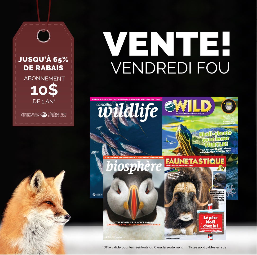 Cette vente #VendrediFou est consacrée à nos incroyables abonnés dans les médias sociaux. Pour un temps limité, un abonnement à un de nos magazines Canadian Wildlife, Biosphère, WILD et le nouveau Faunetastique — habituellement 29 $ et 22 $ — est offert à seulement 10 $. Une facture de 10$ sera envoyée par la poste à l’adresse de facturation.