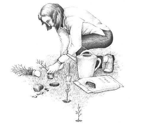 • Retirez le sac de toile. Placez l’arbre dans le trou que vous venez de creuser, puis tassez la terre fermement autour des racines avec vos mains nues. Arrosez abondamment l’arbre, puis tassez la terre de nouveau.