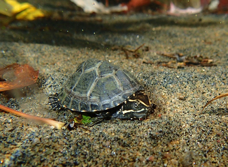 La tortue musquée a une carapace étroite et très voûtée. Cette tortue au corps et à la carapace de couleur brunâtre a habituellement deux rayures sur les côtés de la tête, une au-dessus et une au-dessous de l’œil. Si elle est dérangée, elle émet une odeur de musc, semblable à celle de la mouffette.