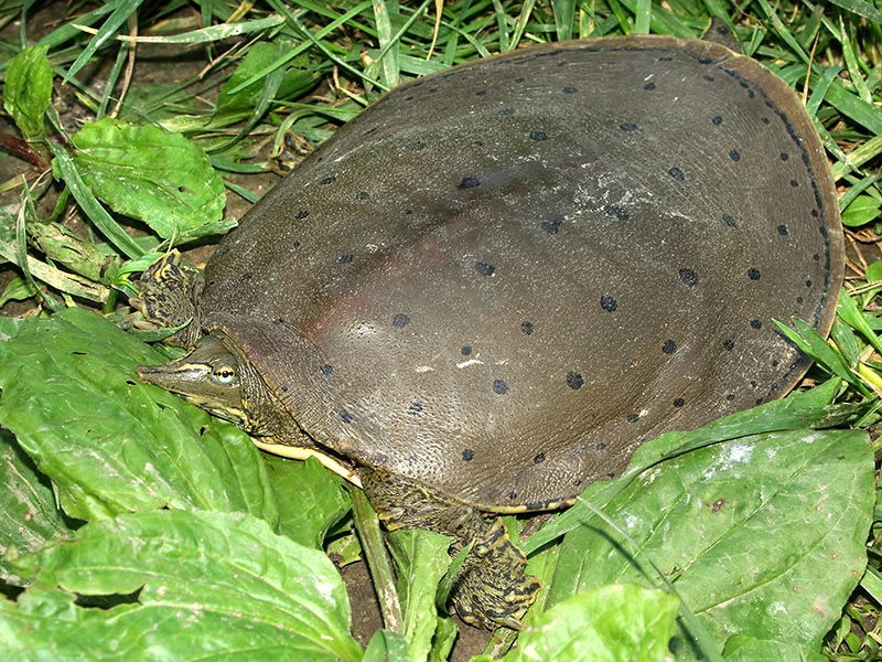 La tortue molle à épines à une carapace plate et parcheminée d’un brun verdâtre. Elle a un long cou et un nez en forme de trompe.