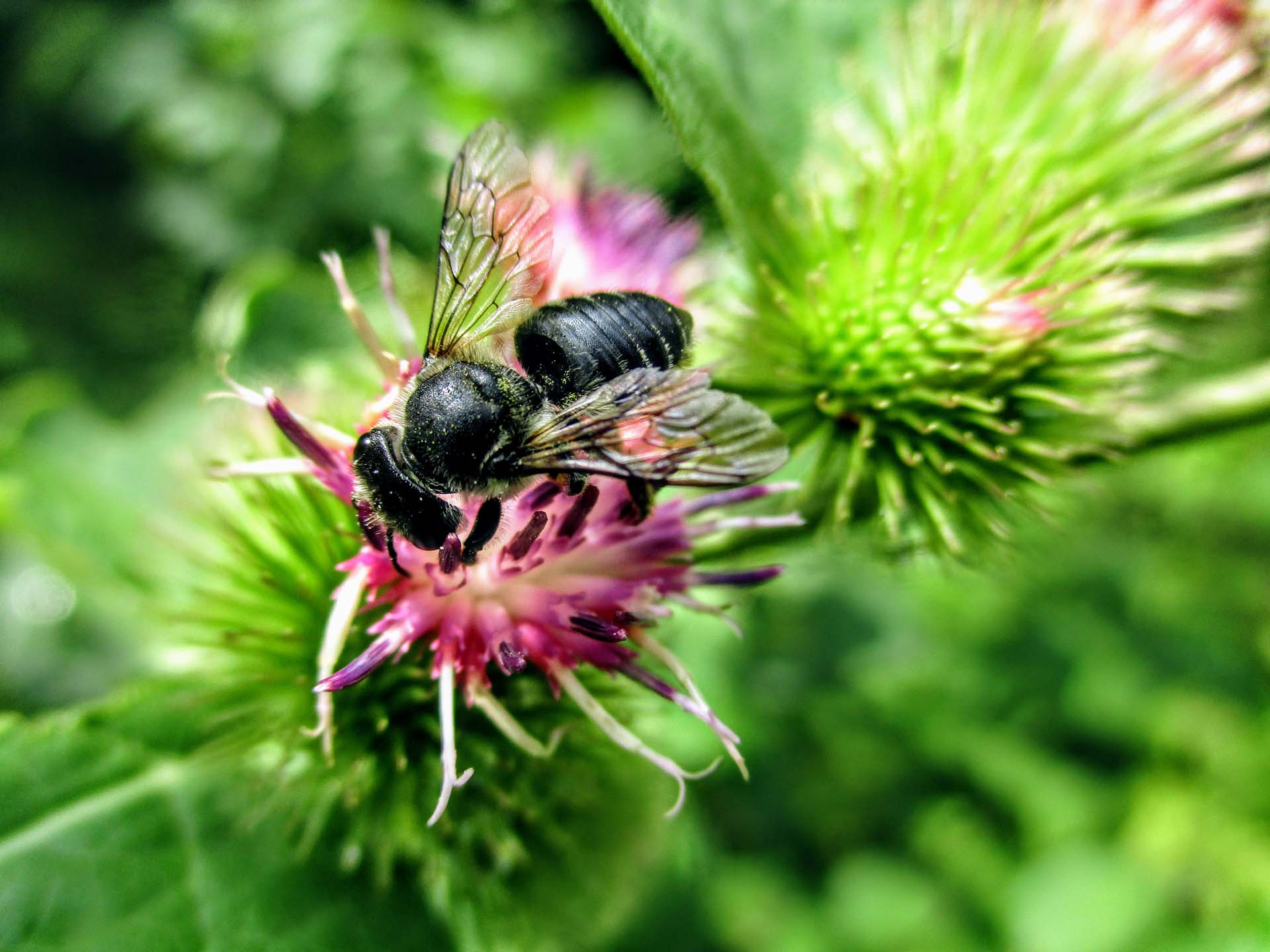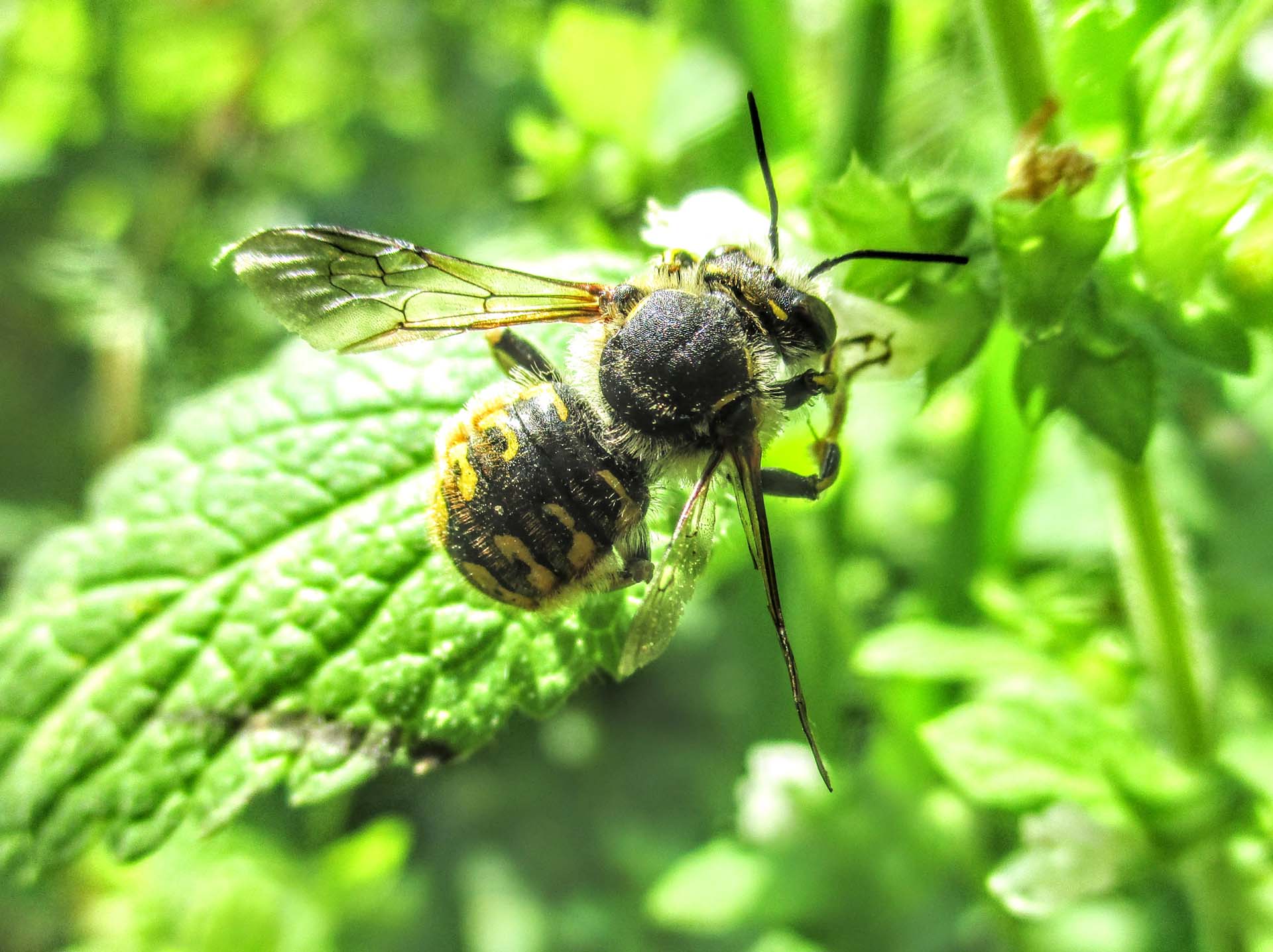 Noir et jaune, les abeilles de la famille des Anthidium sont robustes et de taille moyenne (de 8 à 17 mm). Elles ne sont pas très communes au Canada avec seulement cinq espèces et du nombre, deux ont récemment été introduites d’Europe (dans les dernières décennies). Contrairement à la plupart des espèces d’abeilles, les mâles sont plus gros que les femelles. Ils peuvent être observés en vol stationnaire devant les fleurs.