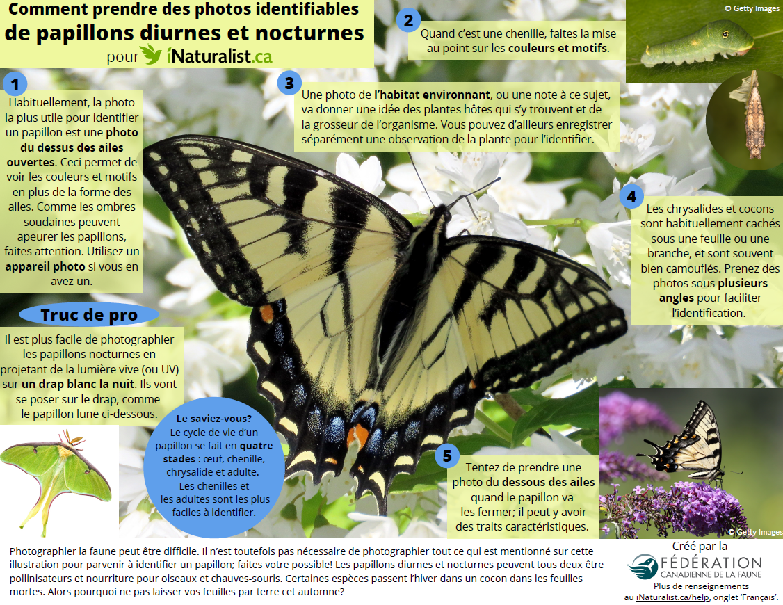 Photographier la faune peut être difficile. Il n’est toutefois pas nécessaire de photographier tout ce qui est mentionné sur cette illustration pour parvenir à identifier un papillon; faites votre possible! Les papillons diurnes et nocturnes peuvent tous deux être pollinisateurs et nourriture pour oiseaux et chauves-souris. Certaines espèces passent l’hiver dans un cocon dans les feuilles mortes. Alors pourquoi ne pas laisser vos feuilles par terre cet automne?
