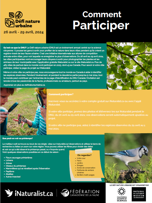 La nature est partout, même en ville! Et quand nous connaissons les espèces qui s’y trouvent et oùelles se situent, nous pouvons mieux les protéger. Toutefois, la SEULE façon d’atteindre cet objectif,c’est en travaillant ensemble – scientifiques, propriétaires fonciers, citoyens – pour brosser le portraitde la nature qui nous entoure. En participant au Défi nature urbaine, vous apprendrez à mieuxconnaître votre faune et flore locale, en plus d’aider à faire de votre ville un meilleur endroit où vivre –pour vous et pour les autres espèces!
