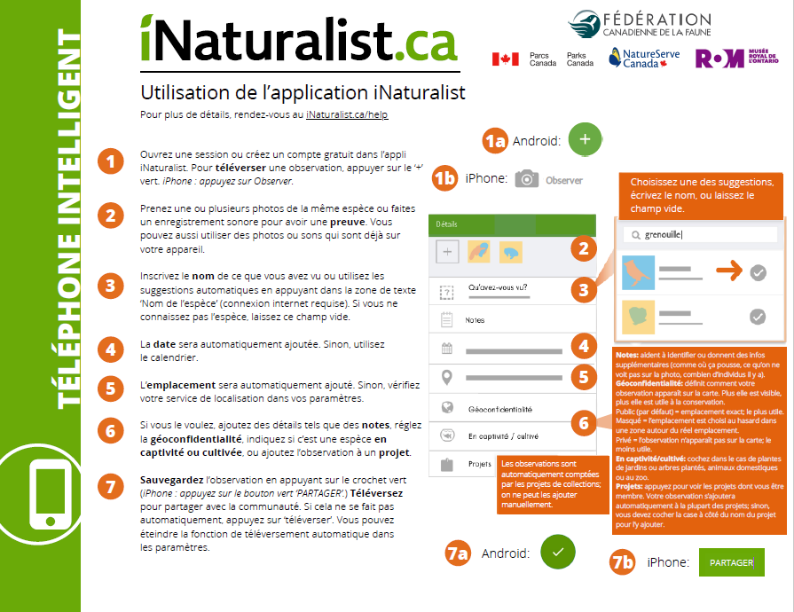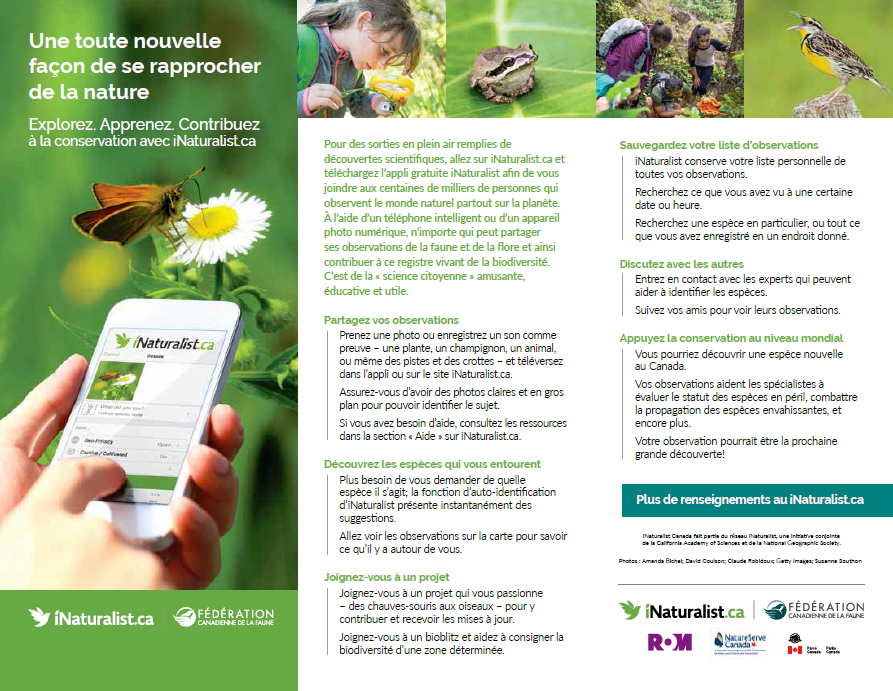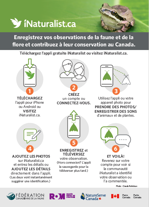 Pour des sorties en plein air remplies de découvertes scientifiques, allez sur iNaturalist.ca et téléchargez l’appli gratuite iNaturalist afin de vous joindre aux centaines de milliers de personnes qui observent le monde naturel partout sur la planète. À l’aide d’un téléphone intelligent ou d’un appareil photo numérique, n’importe qui peut partager ses observations de la faune et de la flore et ainsi contribuer à ce registre vivant de la biodiversité. C’est de la « science citoyenne » amusante, éducative et utile.