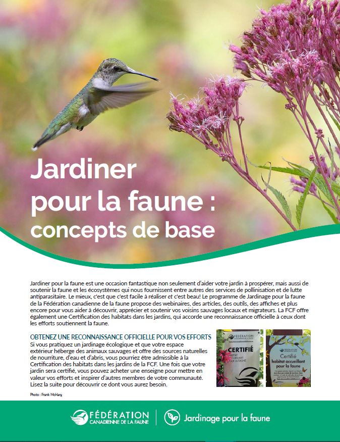 Jardiner pour la faune est une occasion fantastique non seulement d’aider votre jardin à prospérer, mais aussi de soutenir la faune et les écosystèmes qui nous fournissent entre autres des services de pollinisation et de lutte antiparasitaire. Le mieux, c'est que c'est facile à réaliser et c'est beau! Le programme de Jardinage pour la faune de la Fédération canadienne de la faune propose des webinaires, des articles, des outils, des affiches et plus encore pour vous aider à découvrir, apprécier et soutenir vos voisins sauvages locaux et migrateurs. La FCF offre également une Certification des habitats dans les jardins, qui accorde une reconnaissance officielle à ceux dont les efforts soutiennent la faune.
