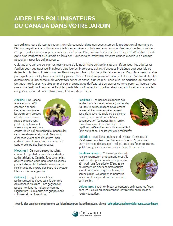 Les pollinisateurs du Canada jouent un rôle essentiel dans nos écosystèmes, la production alimentaire et l’économie grâce à la pollinisation. Certaines espèces contribuent aussi au contrôle des insectes nuisibles. Ces petits alliés sont aux prises avec de nombreux défis, comme les pesticides et la perte d’habitats. Il est donc plus important que jamais de les aider. Pour ce faire, transformez votre espace extérieur en espace accueillant pour les pollinisateurs.