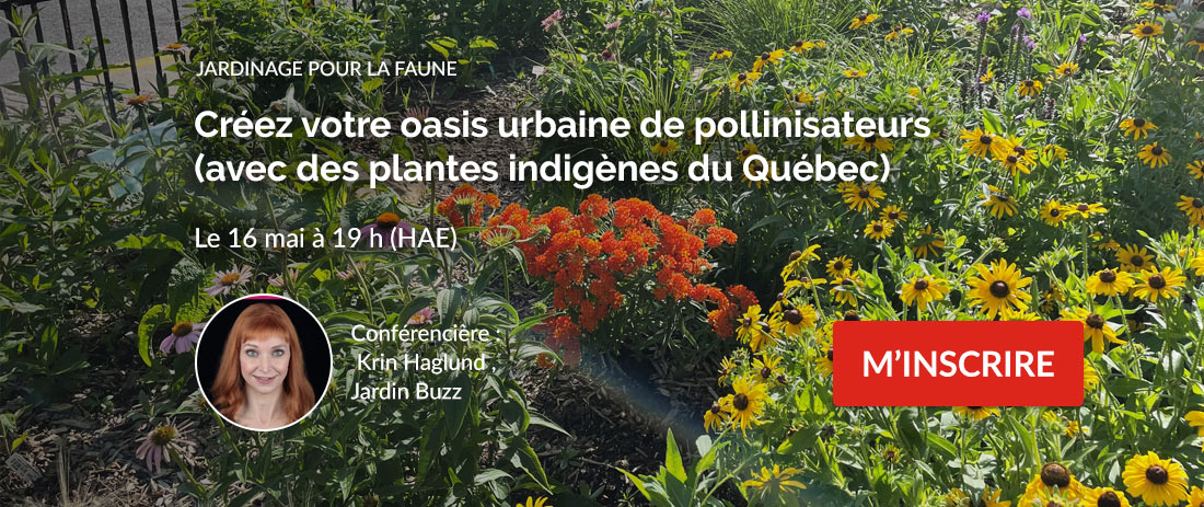 Joignez-vous à la FCF le 16 mai à 19 h (EST) en tant qu’invité(e) spécial(e). Krin Haglund, de Jardin Buzz, présentera certaines des belles plantes indigènes du Québec et montrera comment les utiliser dans votre jardin. La situation de nos pollinisateurs indigènes est préoccupante, mais faire partie de la solution peut être motivant! Krin vous aidera à apporter de la joie, de la vie et de l’animation à votre jardin urbain! Vous apprendrez à créer un jardin de pollinisateurs indigènes exubérant, même dans de petits espaces. Krin présentera également des exemples inspirants et des techniques utiles pour des situations particulières, comme des solutions de remplacement des pelouses et le jardinage en conteneur. Vous découvrirez également des techniques vous permettant de conserver, de démarrer et de planter des semences de plantes indigènes. Bien que les plantes présentées soient adaptées à la région de Québec, les astuces et les techniques sont applicables à tous les jardiniers. Nous espérons que vous pourrez participer à cet événement! Veuillez noter que ce webinaire ne sera offert sous forme d’enregistrement qu’à ceux qui s’inscriront pour le visionner quelques jours plus tard. Veuillez vous inscrire pour ne rien manquer!