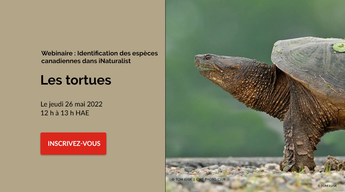La Fédération canadienne de la faune (FCF) vous invite à un webinaire sur comment photographier et identifier les tortues quand vous utilisez iNaturalist Canada. David Seburn, l’expert en tortues de la FCF, présentera le webinaire en anglais, tandis qu’Annie Bélair, la réviseuse de la FCF et technicienne en foresterie, présentera le webinaire en français. Les populations de tortues d’eau douce sont en déclin partout au Canada. Le programme Aidonslestortues.ca de la FCF travaille fort pour les aider, mais nous avons besoin de vous! La première étape pour résoudre le problème, c’est de savoir où se trouvent les tortues. En compilant toutes les observations, nous pouvons déterminer les routes où des mesures d’atténuation seraient les plus bénéfiques et repérer les zones humides qu’il faut surveiller. Quand vous enregistrez vos observations de tortues sur iNaturalist.ca, vous pouvez aider directement à la conservation. iNaturalist est rendue l’une des applis sur la nature les plus populaires du monde, et la FCF s’est occupée de la promouvoir au premier plan de la science citoyenne au Canada. La FCF effectue des inventaires de tortues en péril le long des routes et zone humides et travaille avec le Scales Nature Park, mais elle ne peut pas être partout. L’info que vous fournissez est essentielle pour nous permettre de travailler avec les municipalités et les agences de transport et réduire les dangers pour les tortues. Venez apprendre comment identifier nos espèces de tortues et comment prendre des photos sur lesquelles il est facile de les identifier. Aidez-nous à les aider! Webinaire en anglais : Date : 24 mai, 12 h à 13 h HAE Animateurs : David Seburn, présentateur; Caitlin Brant, animatrice Webinaire en français : Date : 26 mai, 12 h à 13 h HAE Animateurs : Annie Bélair, présentatrice; James Pagé, animateur